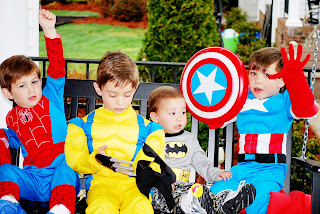Cannon had his birthday party today. It was a superheroes party and all the kids that came were dressed up. We were supposed to have the party at our house but we got rained out and moved it to the high school gym. I had the daunting task of getting all four boys dressed in their costumes and at the party 15 minutes early. I was the superhero for pulling this off. Trying to adjust shoes, masks and gloves for four overly excited boys was quite a job. But we made it...and we were even on time.